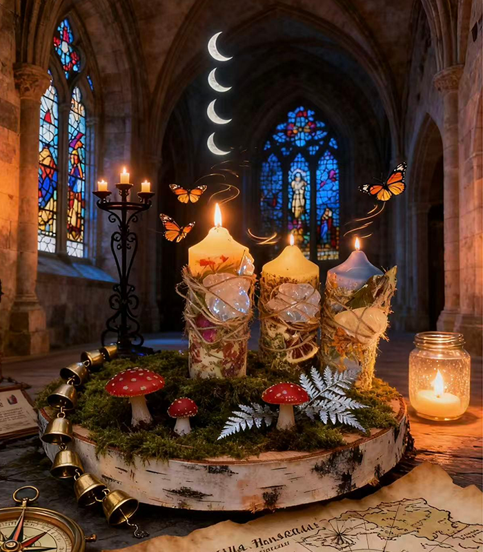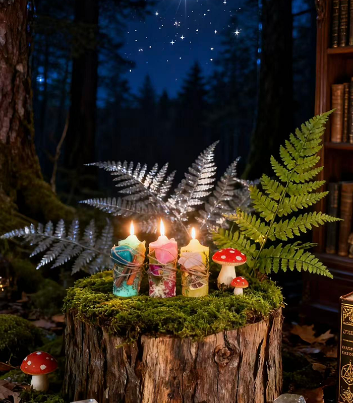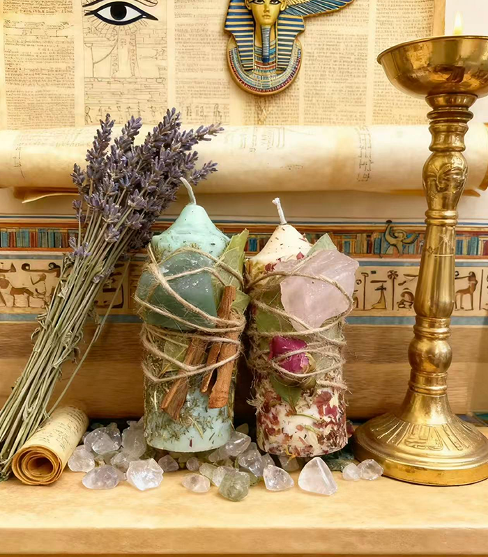 Pocket-sized guardians wrapped in herbs and raw crystals—each flame feels like a tiny spirit saying, “I’ve got your back today
