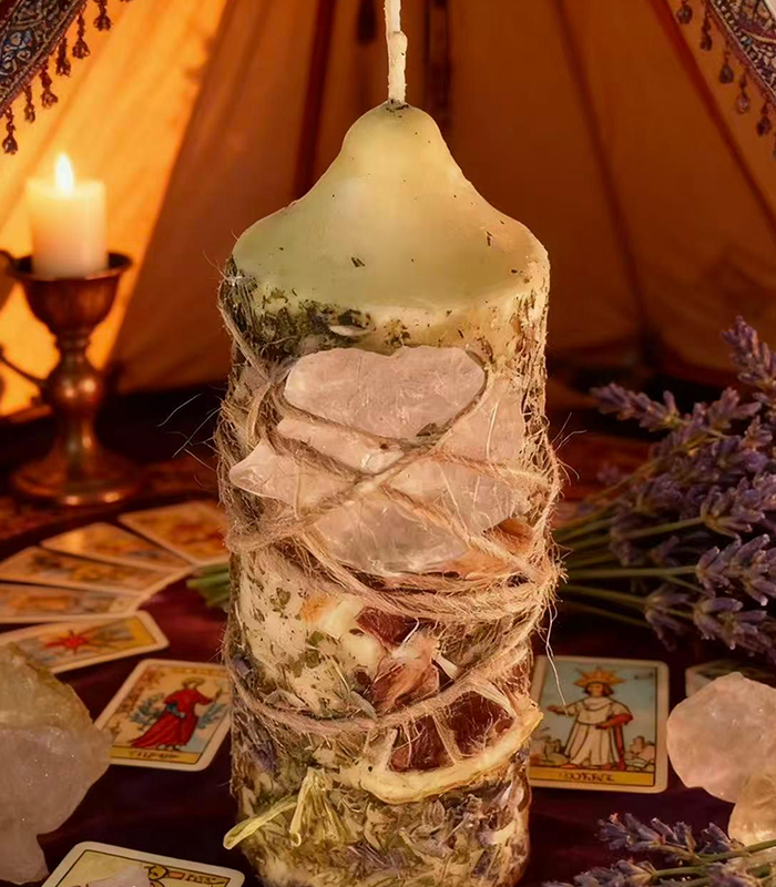 Each candle carries herbs, raw crystals, and a talisman charm—her small energetic ally: courage in her bag, protection on her desk, softness by her bed.